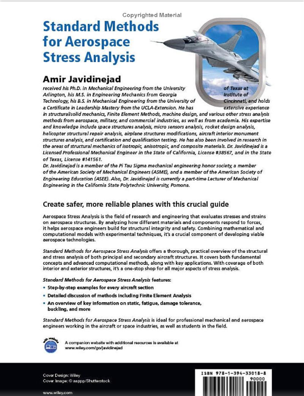 Aerospace Stress Analysis is the field of research and engineering that evaluates stresses and strains on aerospace structures. Analyzing how different materials and components respond to forces, This helps aerospace engineers build for structural integrity and safety. Combining mathematical and computational models with experimental techniques, it’s a crucial component of developing viable aerospace technologies. Standard Methods for Aerospace Stress Analysis offers a thorough, practical overview of the structural and stress analysis of both principal and secondary aircraft structures. It covers both fundamental concepts and advanced computational methods, along with key applications. With coverage of both interior and exterior structures, it’s a one-stop shop for all major aspects of stress analysis.